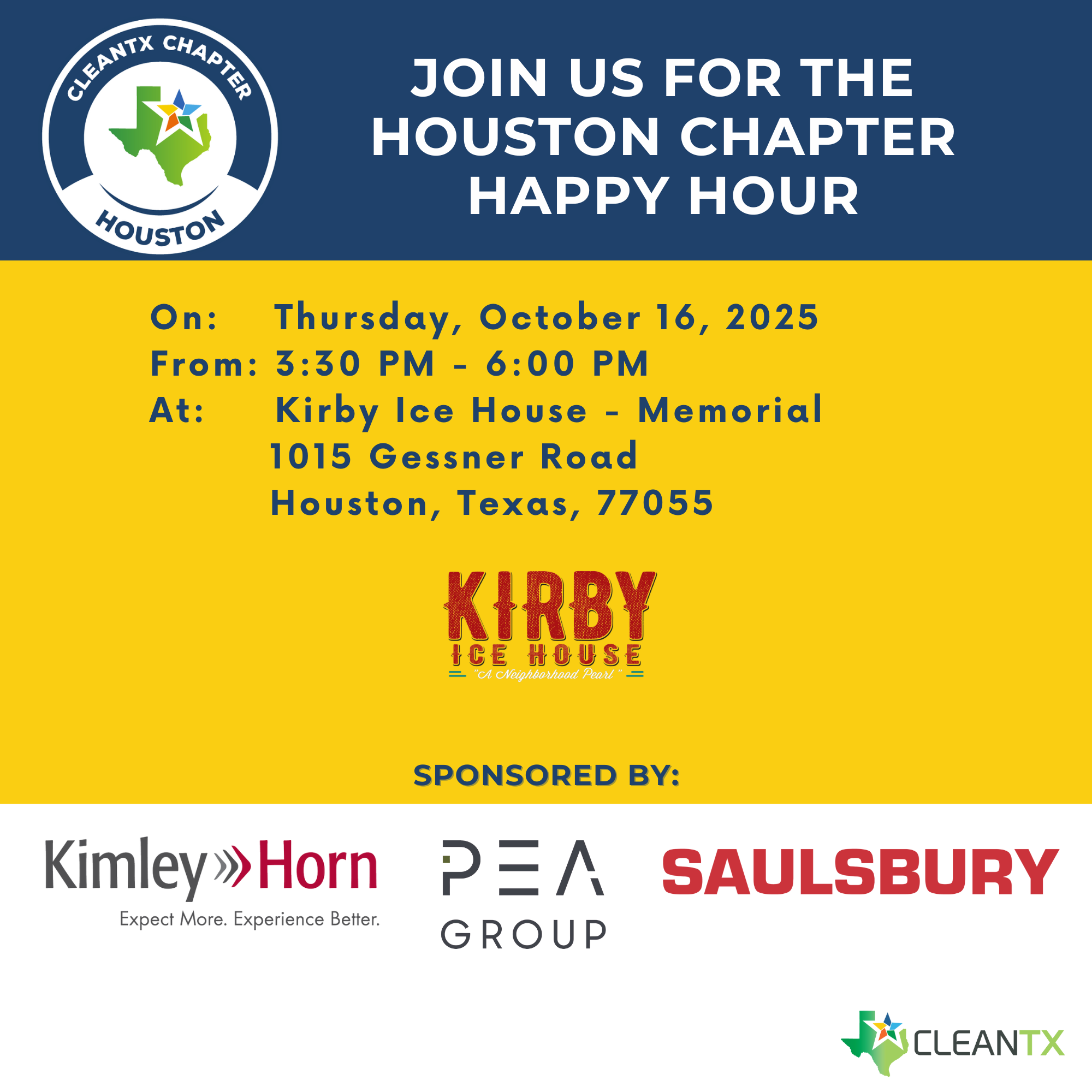Join us at our CleanTX Houston Chapter Happy Hour on October 16, from 3:30–6 PM at Kirby Ice House Memorial (1015 Gessner Rd, Houston, TX 77055, USA) 📍